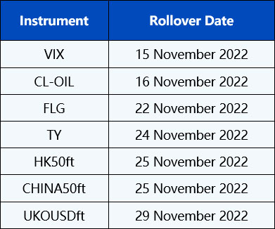 Please be advised that the following CFD instruments will be automatically rolled over as per the dates in the table below. As there can be a pricing difference between old and new futures contracts, we recommend clients to monitor their positions closely and manage positions accordingly.
