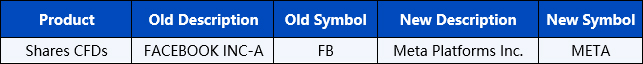 With FACEBOOK INC-A (FB) has changed its corporate name to Meta Platforms Inc. (META) as part of a major rebrand, PU Prime will update the symbol to META effective from 20th June 2022.