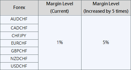 Please be aware that to keep open positions of CHF products and CHF Crosses products, the current margin requirement has been adjusted to 5 times more as compared to previous, we recommend clients to properly control their positions and trade cautiously.