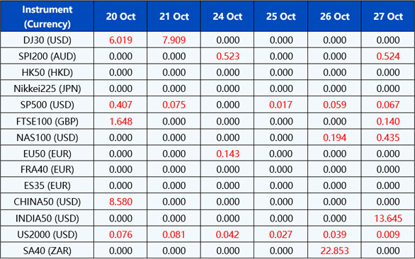 Please be advised that the dividends of the following index CFDs will be adjusted by upcoming ex-dividend dates. The comment for trading index CFDs will be in the following format “Div&<Product Name>&<Net Volume>” which show in the balance after the close of the day before the dividend payment date.